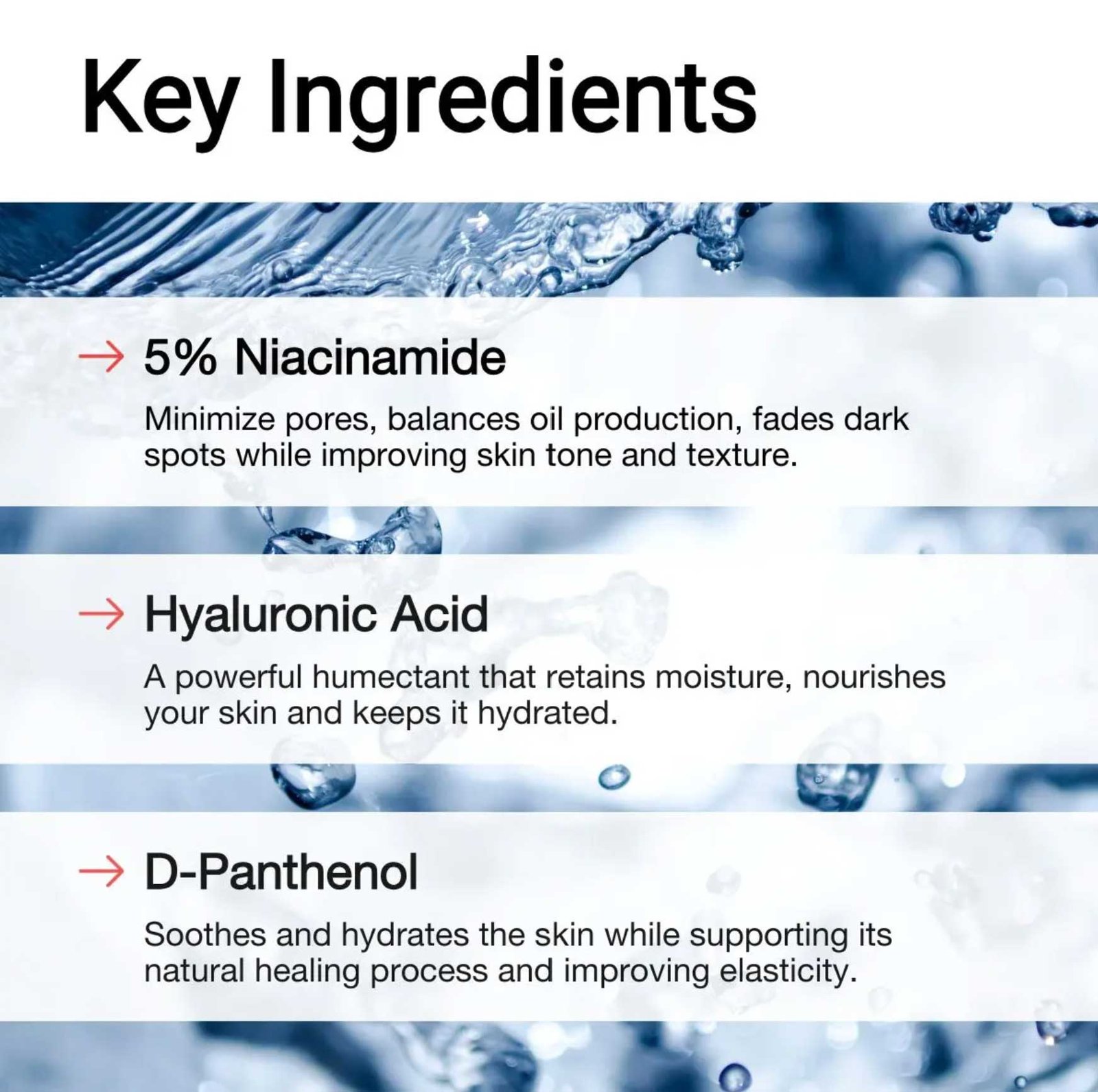 Formulated with clinically proven, 5% niacinamide, panthenol & hyaluronic acid. Improves skin tone, regulates oil production, refines pores and strengthens your skin barrier.